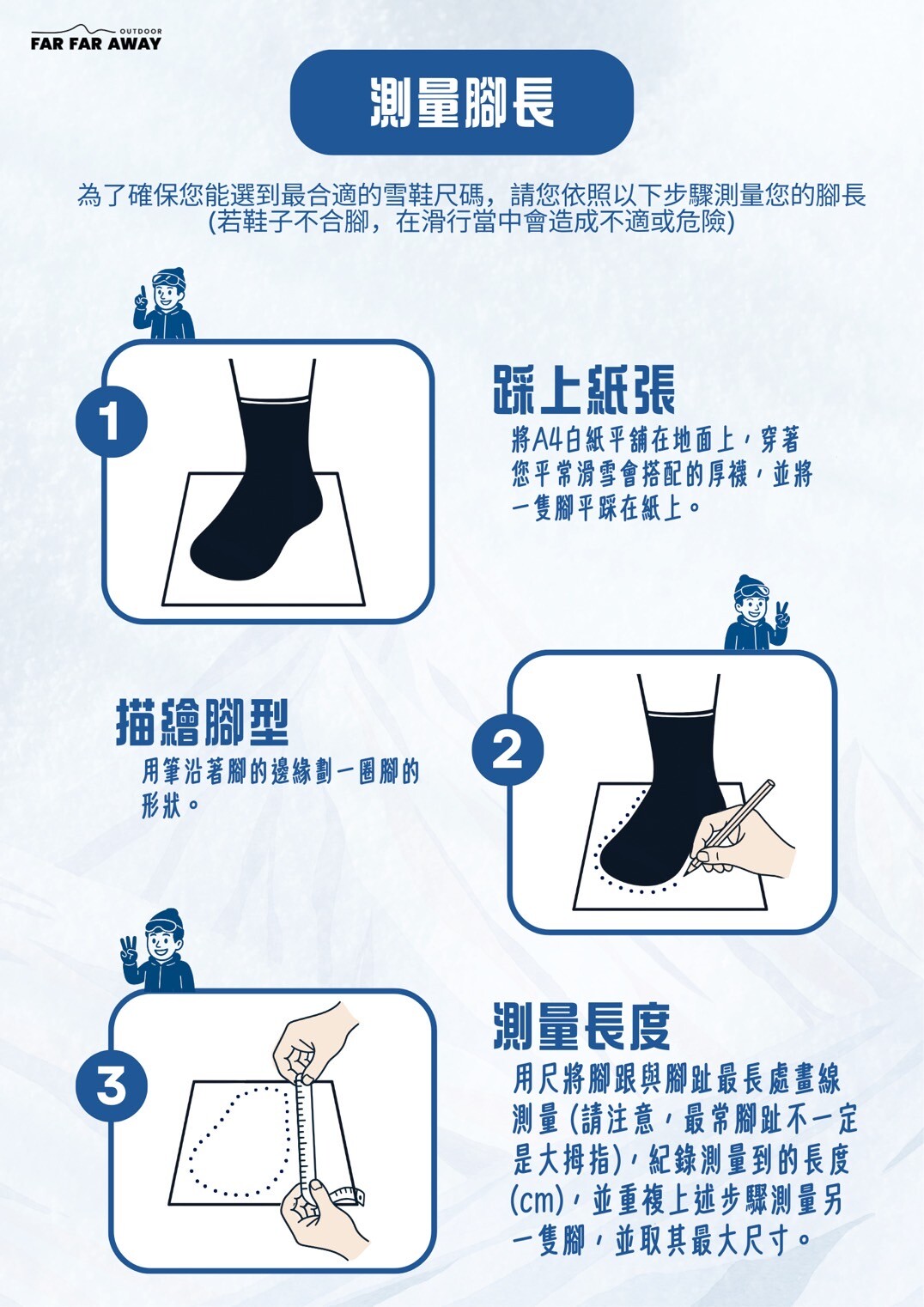 • 雪鞋尺寸(Boots):15.5 cm ~ 30.0 cm - 腳長測量請參考下圖: